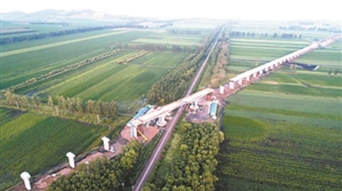 图为7月19日牡佳客专跨佳富铁路1号特大桥转体连续梁成功转体合龙。