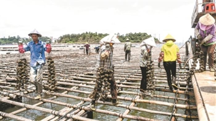 在钦州市龙门港连片万亩大蚝养殖基地,村民在往收购商的船只上运送收取的大蚝(7月20日摄)。