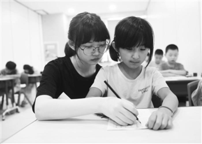 7月20日,“小候鸟”在大学生志愿者的辅导下上硬笔书法课。