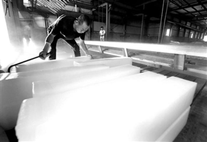 7月22日,江苏省太仓市浏河镇的工人们正在生产供应市场的冰块。眼下正是一年中最热的季节,冰块生产迎来旺季。