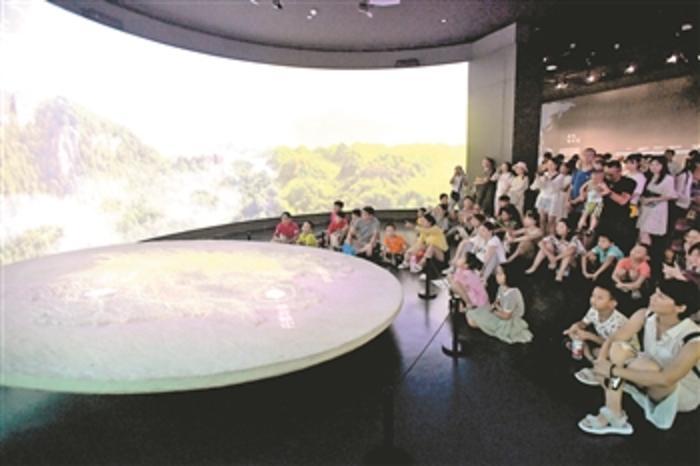 图为7月24日,家长和孩子在湖南省博物馆观看科普短片。