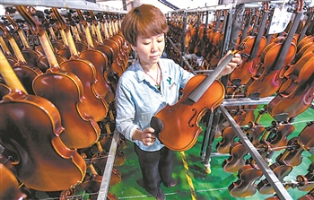 7月24日,河北省武强县一家乐器企业的工作人员在查看一把小提琴。