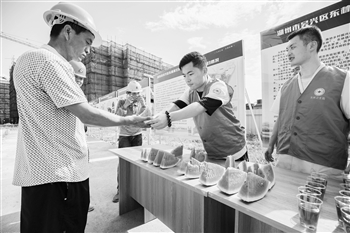 7月23日,在湖州市东林镇一处工地上,东林镇卫生院的医护人员和志愿者给劳动者送来西瓜和凉茶。