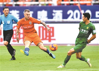 7月24日,山东鲁能泰山队球员格德斯(中)在比赛中射门。