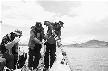 目前,第二次青藏高原综合科考正在对羊卓雍错进行深度测量,并测算水量。这是中国科学家首次对羊卓雍错进行全面的水深等深线测量。羊卓雍错简称羊湖,位于西藏山南市浪卡子县境内,距拉萨不到100公里,其自然景色优美,是西藏的热门旅游景点之一。图为科考队员在投放重力钻,准备钻取湖泊沉积岩芯。