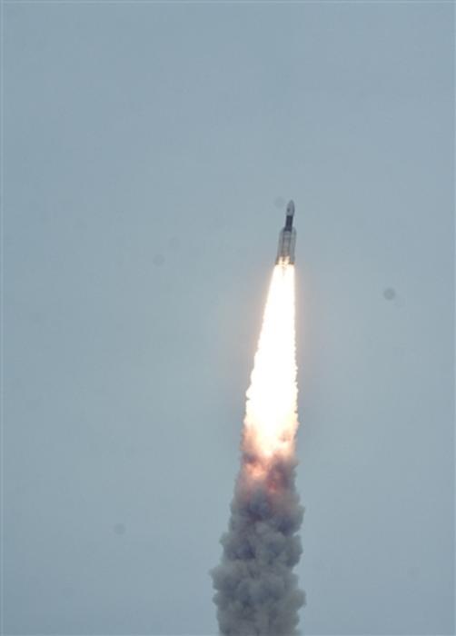 7月22日,在印度安得拉邦的萨蒂什·达万航天中心,搭载“月船2号”月球探测器的GSLV MK-III运载火箭发射升空。新华社发