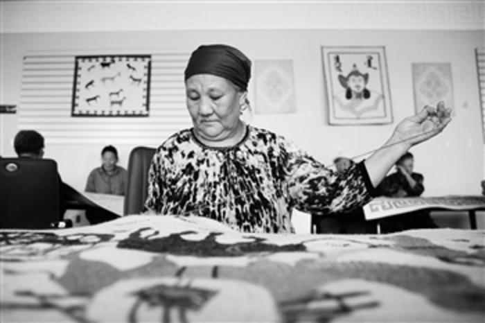 7月24日,内蒙古自治区苏尼特右旗的一间毡绣车间,70岁的娜仁其其格正在绣五畜图,每个月有2000元左右的收入。苏尼特右旗是国家级贫困旗,近年来,当地政府积极挖掘非遗毡绣特色手工艺,为农牧民开辟多种就业渠道,引导贫困户走“多业增收”发展之路,让不少农牧民可以发挥自身特长,实现家门口就业。据介绍,目前该毡绣车间有员工100多人,98%都是牧区女劳力,吸纳建档立卡贫困户34人,其中19人享受了该旗劳务补贴政策。 本报记者 王伟伟 摄