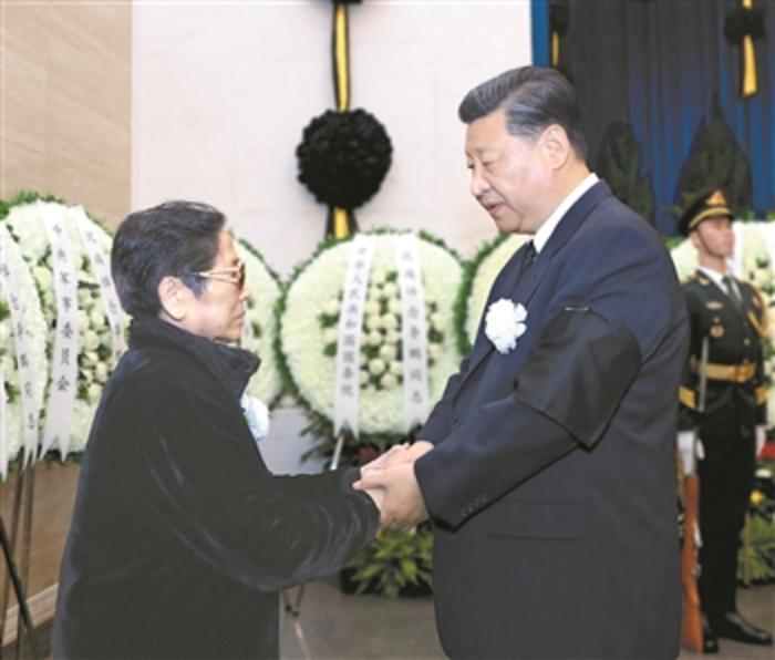 7月29日,李鹏同志遗体在北京八宝山革命公墓火化。习近平、李克强、栗战书、汪洋、王沪宁、赵乐际、韩正、王岐山、江泽民等前往八宝山送别,胡锦涛在外地送花圈表示哀悼。这是习近平与李鹏亲属握手,表示深切慰问。