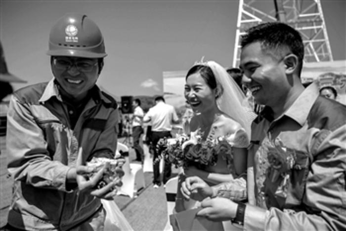 7月30日,在河北省保定市涞源县的特高压工程立塔施工工地上,新人以喜糖答谢同事。