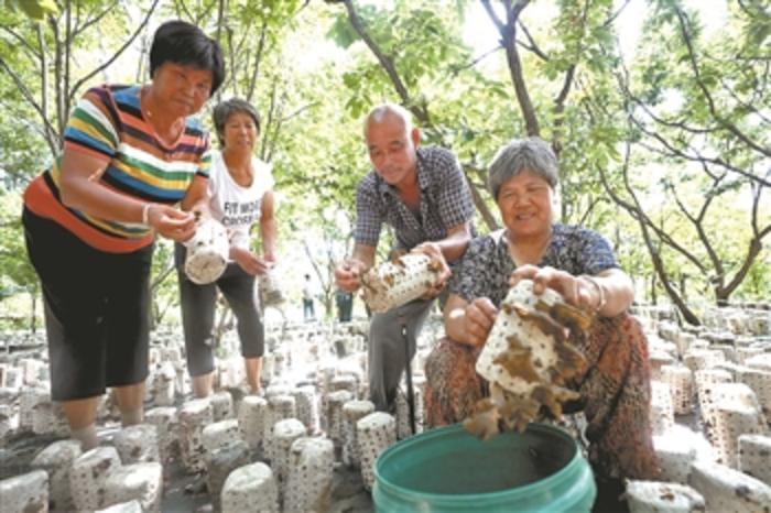 7月30日,北京市密云区南沟村村民正在采摘蘑菇,种植一茬(两个半月)下来,每户能有2万元左右的收入。