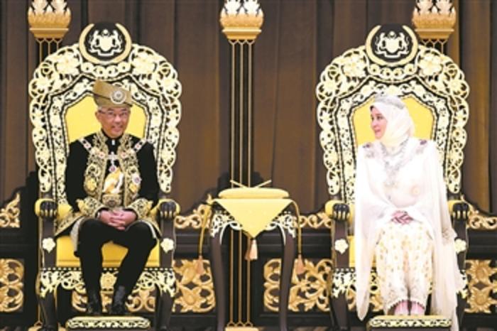 7月30日,在马来西亚吉隆坡,马来西亚第16任最高元首阿卜杜拉(左)出席登基仪式。新华社发 (马来西亚新闻局)