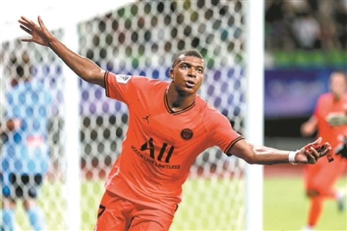 7月30日,在江苏苏州举行的2019国际超级杯苏州站比赛中,法甲巴黎圣日尔曼队3比0击败澳超悉尼FC队。巴黎圣日尔曼队球员姆巴佩在比赛中庆祝进球。