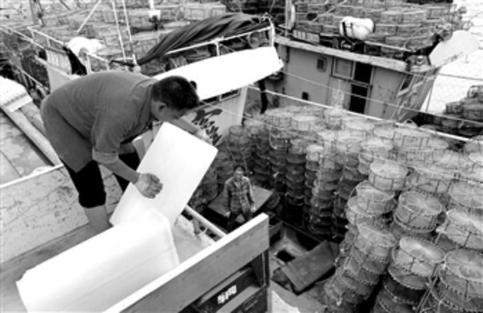7月31日,江苏省连云港市连云区连岛渔业码头,渔民正在向渔船上搬运冰块。