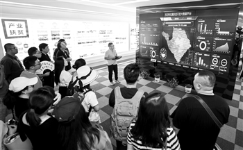 图为讲解员正通过扶贫开发大数据平台为来访者介绍当地脱贫情况。