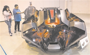 7月28日,在美国德克萨斯州休斯敦,人们观赏一辆以蝙蝠侠题材电影《黑暗骑士》为主题的“北极星弹弓”定制车。