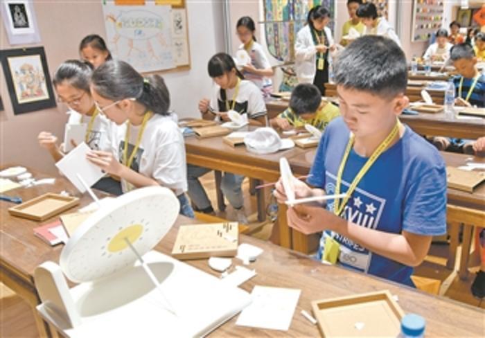 8月2日,学生们在故宫内参加制作古代计时器的课程。当日,故宫博物院举办的2019“大国工匠出少年”文物修复夏令营闭营。在为期6天的夏令营里,来自国内各地的30多名中小学生学习文物修复技艺、字画装裱技艺和相关文物知识,感受中华传统文化的博大精深。 新华社记者 李欣 摄