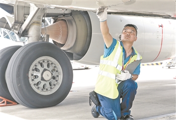 图为7月31日,维修工程师宋波在上海浦东国际机场对进场飞机进行例行维护。当日,上海最高温超过了35℃。
