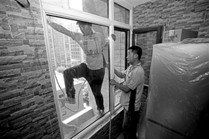 在北京朝阳区王四营地区的一个小区,郑亚兵(左)、宫振华在安装空调室外机支架(7月30日摄)。炎炎夏日,空调的销售、安装、维修迎来高峰期。记者在采访跟拍中记录下他们在高温下挥汗如雨的工作场景,也记录下他们在十几层楼外高空作业的惊险瞬间。 新华社记者 才扬 摄
