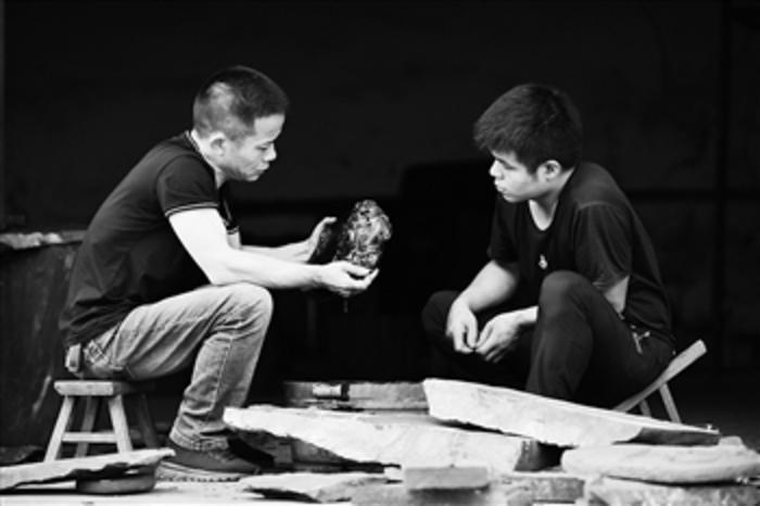 图为周永平在给徒弟演示清洗思州石砚。
