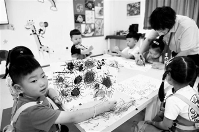 图为8月6日,孩子们在吴兴区青少年活动中心参加幼儿绘画课。