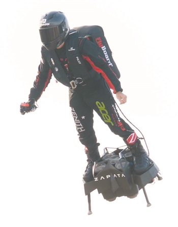他没有止步于此,继续改进自己的发明,仅用几年时间就推出了“空中飞板”。“空中飞板”由5个小型涡轮喷气发动机提供动力,以飞行者背包中的煤油作为燃料,在空中最高速度可达每小时190公里。