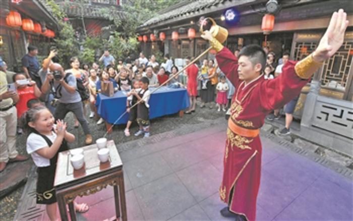食客在成都市宽窄巷子景区内的火锅店观看功夫茶表演(8月4日摄)。