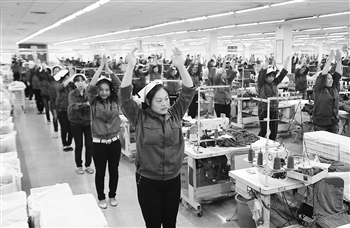 图为2014年10月21日,山东青岛即发集团的女工在缝纫机台旁做工间操。
