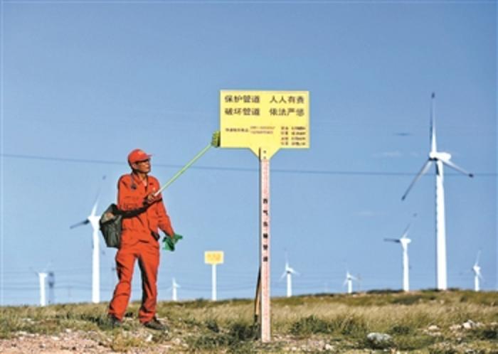 8月10日,中石油西气东输宁夏中卫站巡线工姚会春清洁输气管线标识牌,他每天巡线路程单趟是8公里。