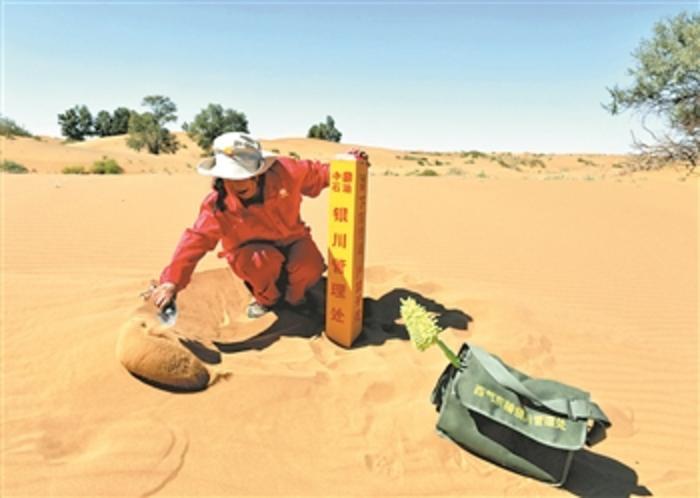 8月11日,中石油西气东输银川管理处44岁的职工陶秀花,冒着近40摄氏度的高温清理被沙漠包围的百米标识桩。