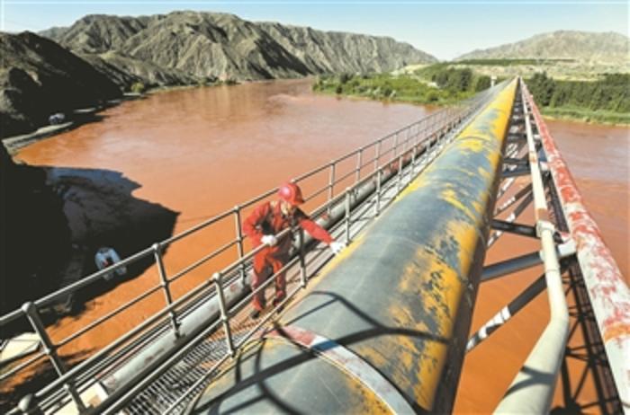 上图为8月11日,中国石油西气东输管道公司宁夏中卫站线路管理员柳银平,在距离黄河水面近30米的高空通道进行线路巡查。