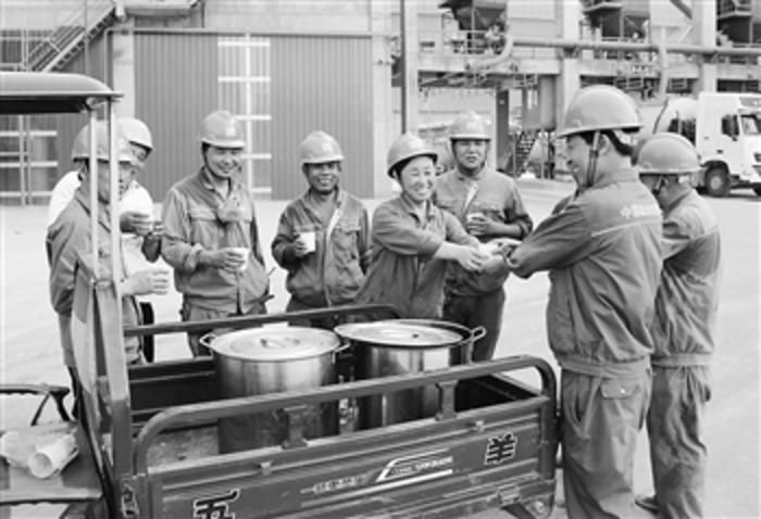 “小王,喊错了,这是送清凉,不是送温暖!这室外温度都40摄氏度了,还‘送温暖’,我们可受不了。”衣服湿透半截的老刘停下手头的工作,擦了一把脸上的汗,笑着说。