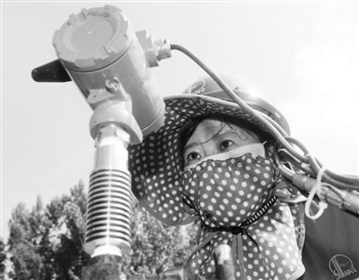 8月的骄阳下,河南油田采油二厂井楼采油管理区44号计量站的采油女工摇身一变,成了“蒙面大侠”——涂上厚厚的防晒霜,戴上轻薄透气的连体遮阳帽,再戴上安全帽,只留下洞察油井变化的“火眼金睛”。