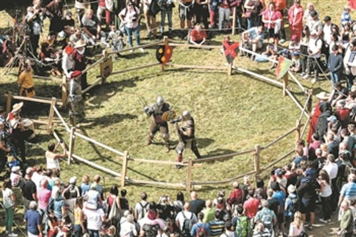 8月10日,在比利时布永,游客在中世纪风情节上观看武士格斗。