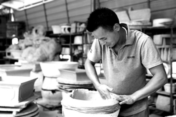 今年41岁的赵勇是广西桂平市社坡镇福和村农民。2015年,在广东务工多年的赵勇回乡创办陶瓷制品加工厂。在当地党委、政府支持和自身努力下,如今,加工厂发展得有声有色。图为赵勇将泥坯放进模具里。新华社记者 曹祎铭 摄