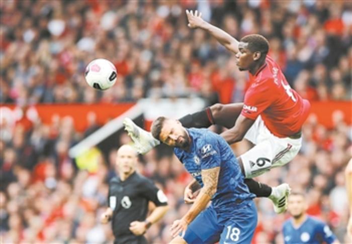 图为曼联队球员博格巴(右)和切尔西队球员吉鲁拼抢。新华社/路透