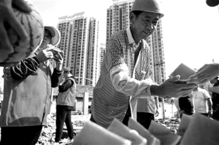 8月13日,社区志愿者为施工人员送上西瓜。近日,安徽合肥持续高温天气,合肥市包河区常青街道凌大塘社区的志愿者来到辖区工地,为施工人员送上饮料、防暑药品等防暑降温用品。新华社记者 刘军喜 摄