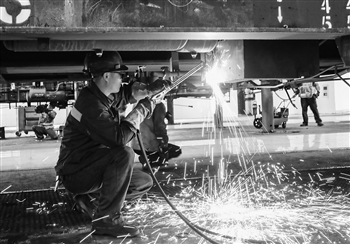 8月12日,中国铁路上海局集团公司南京东车辆段徐州北检修车间一职工在酷热狭小的货车底部进行氧气切割作业。余爱国 摄