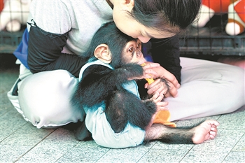 在泰国北榄府的一家动物园,游客可以和猩猩、老虎等动物的幼崽近距离接触,给它们喂食,和它们玩耍,体验“动物保姆”的特殊生活。 新华社发 (拉亨 摄)