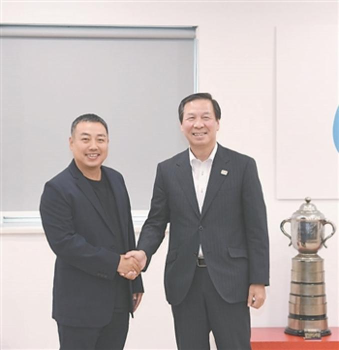 刘国梁(左)与日本乒乓球协会常务理事宫崎义仁在中日少儿挑战赛通气会后合影。
