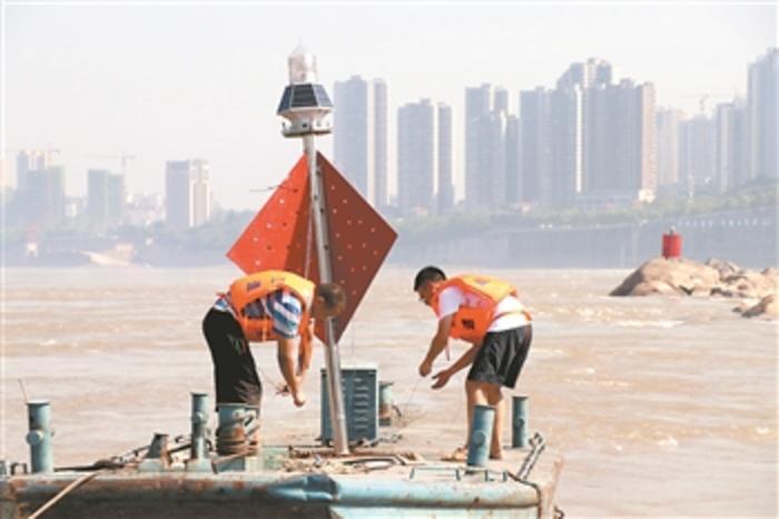 长江重庆巴南航道工作人员冒酷暑顶烈日设置航标。