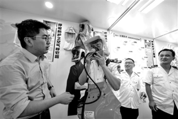 8月20日,在位于湖州市长兴县的浙江省职业卫生现场执法实训基地,学员们正在3M职业健康安全巡回路演车上体验空气呼吸器。