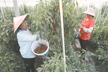 8月19日,江西省兴国县嘉禾力千亩蔬菜基地,王英(图左)和张美华正在采摘辣椒。