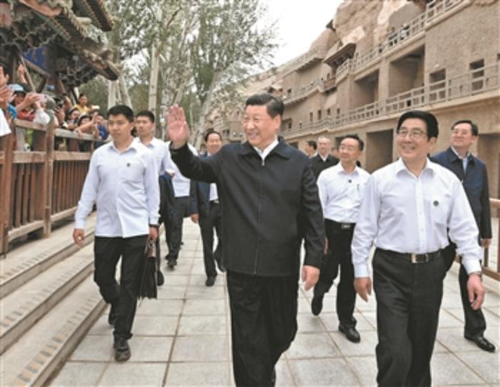 19日上午,习近平从北京乘机抵达酒泉市所辖敦煌市,即前往莫高窟考察了解莫高窟历史沿革和文物保护研究情况,并走进洞窟察看历史悠久的彩塑、壁画。他强调,要十分珍惜祖先留给我们的这份珍贵文化遗产,坚持保护优先的理念,加强石窟建筑、彩绘、壁画的保护,运用先进科学技术提高保护水平,将这一世界文化遗产代代相传。