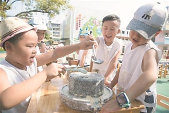 8月20日,江西省赣州市赣县区城关幼儿园的孩子们正在体验当地客家民俗。