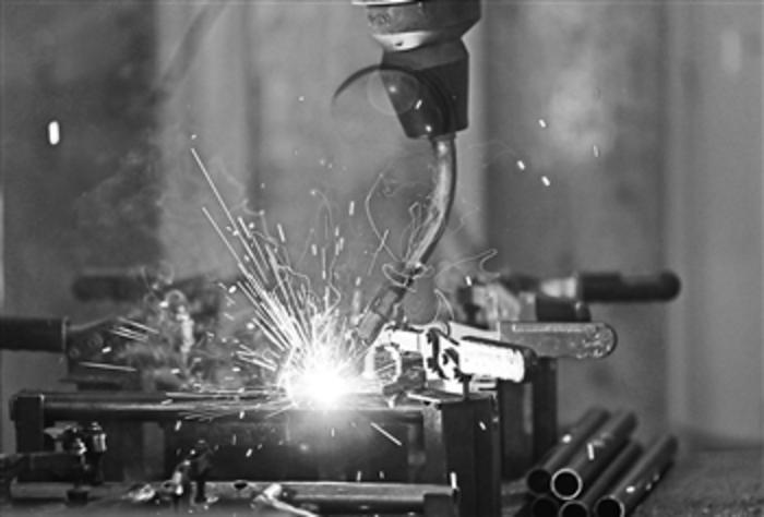 近年来,江西吉安市泰和县推进绿色制造和智能制造融合,实现了传统制造向绿色智能制造转型,助力县域经济高质量绿色发展。图为在泰和高新技术产业园区,灼灼高温下,智能机器人手臂正在进行焊接作业。