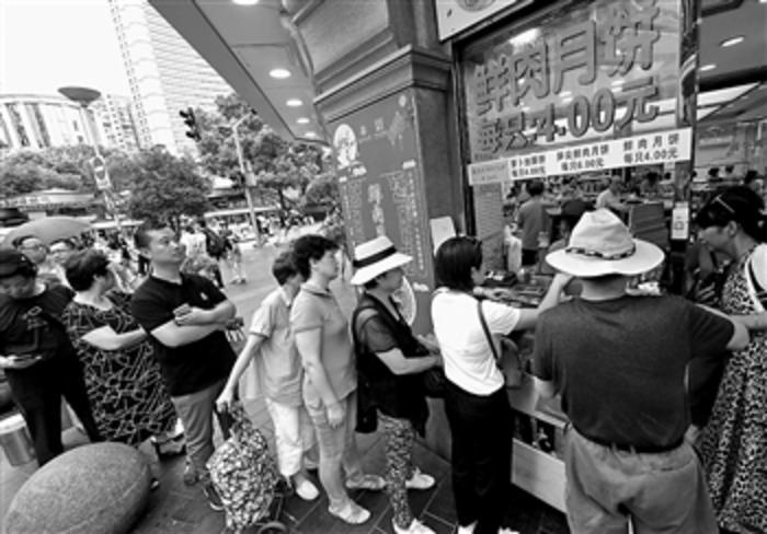 8月23日,游客在上海市南京路步行街上排队购买现烤现售的散装月饼。