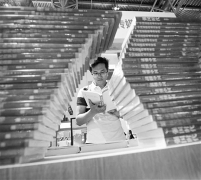 图为读者在“新中国成立70周年精品出版物展”上阅读图书本报记者 王伟伟 摄