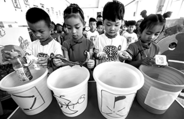 8月26日,河北省故城县中视大风车幼儿园的孩子们在演练垃圾分类。