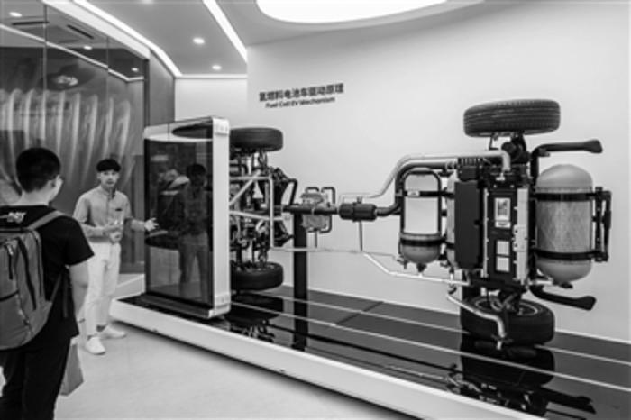 8月26日,上海南京东路世纪广场,搭建起国内首个氢愿景馆——现代氢世界,向公众全方位展示现代汽车在氢能应用、未来氢社会推进与建设上所做的努力和成果。当天下午,不少游客和观众在展馆内了解氢动力技术。据了解,这是国内首个以氢燃料电池技术展示为核心内容的展馆。王冈 摄/视觉中国