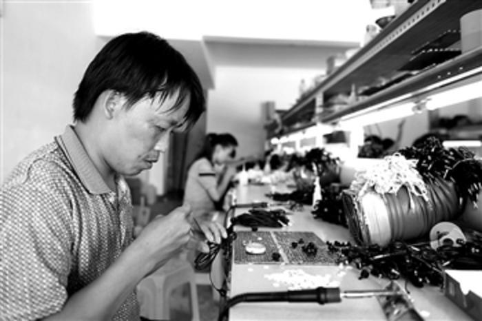 8月28日,龙邦村村民在位于田东县思林镇易地扶贫搬迁安置点内的扶贫车间里工作。